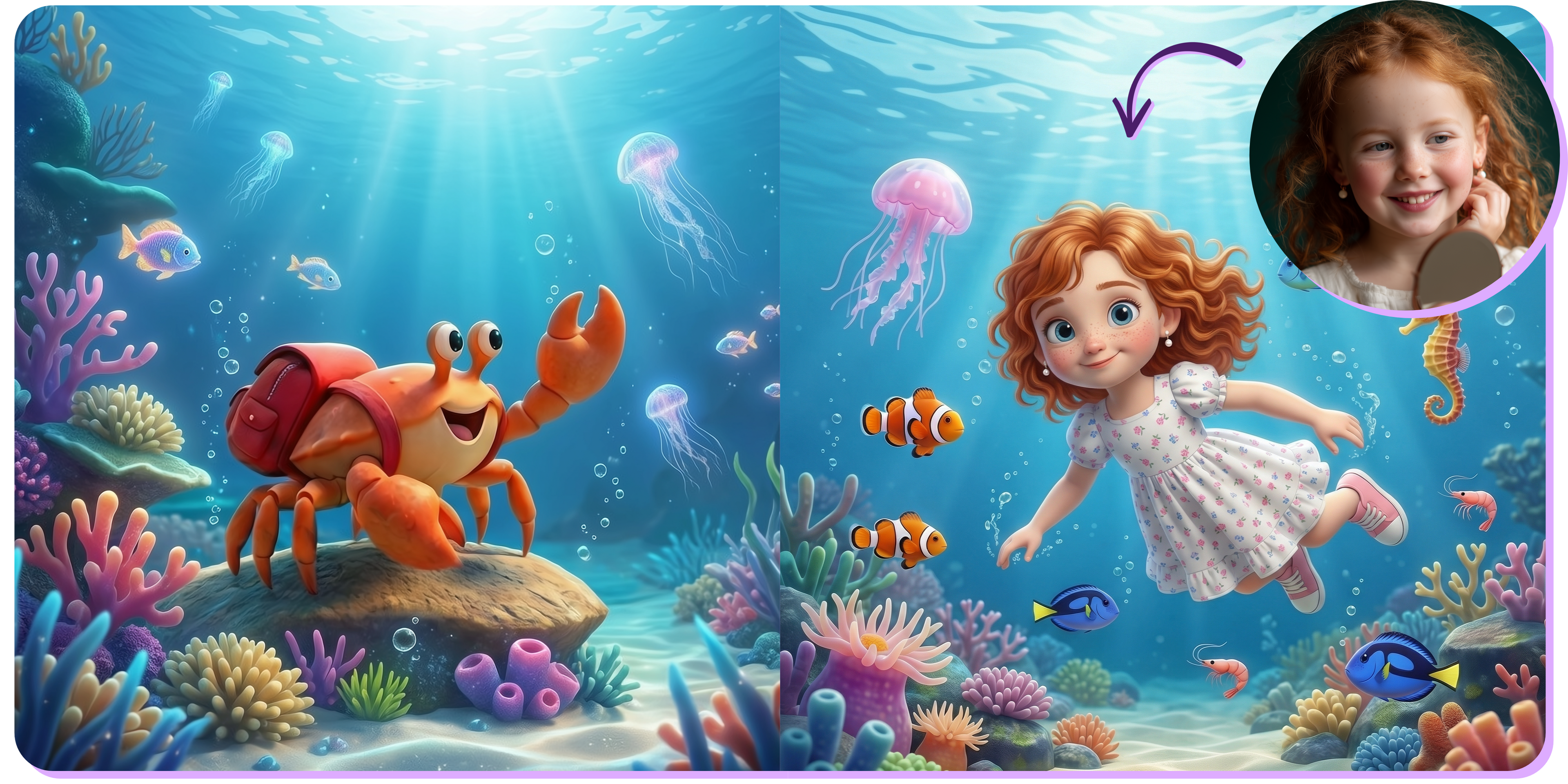 Your child will be lovingly transformed into the hero — with their own face, name, and unique spark.